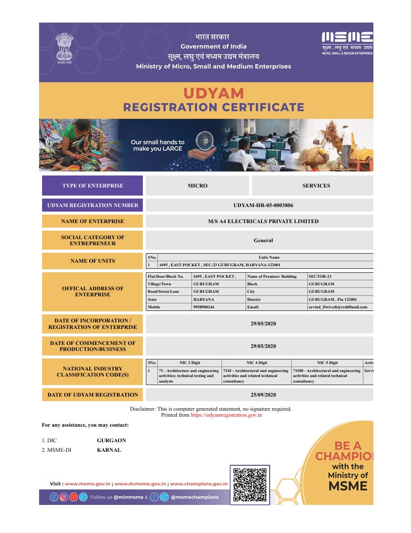 A4 Electricals Private Limited. Established in 2020 is a nationally renowned electrical contracting company. In the span of years, A4 has delivered more than 50 prominent projects to clients across India; A4 has uncompromising policy of quality, safety and timely delivery of projects.